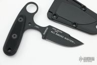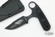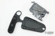 This Tertiary by Esee Knives features a black powder coated blade with a partially sharpened top edge and a full tang construction.  .169" Blade Stock.  1.045" Blade Depth.  Black G10 Scales.  Comes with black plastic sheath.  Excellent Condition.
