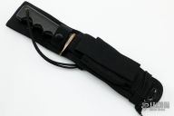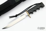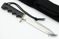 The Model 16-7 Diver was designed especially for heavy-duty salt water use and is as nearly indestructible as possible. This knife has a satin finished stainless steel blade with notched thumbrest, sawteeth and sharpened top edge, .216" blade stock and 1.150" blade depth, full tang construction. The handle has a brass guard, and black linen micarta handle with a lanyard hole. Comes with a black nylon sheath. Has a few light scratches, otherwise excellent condition. "Woolsey" on the blade.