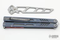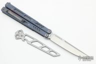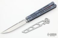 This Balisong by Maxace Knives features a satin finished 14C28N blade with false top edge. The handle has blue G-10 scales, , titanium liners , red aluminum  spacers, tip up stainless steel clip and T-latch. Comes with original zippered case and trainer blade and extra hardware. New from maker.