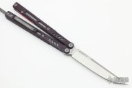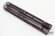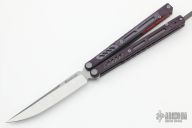 This Balisong by Maxace Knives features a satin finished 14C28N blade with false top edge. The handle has purple G-10 scales, , titanium liners , red aluminum  spacers, tip up stainless steel clip and T-latch. Comes with original zippered case and trainer blade and extra hardware. New from maker.