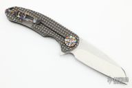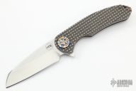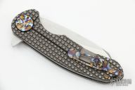 This Large F3 by Curtiss Knives features a stonewashed blade with notched thumbrest and flipper. The handle has a Frag Pattern milled titanium frame with a matching tip up titanium clip. Flamed titanium hardware. Rides on bearings, nice detent and lockup. Comes with a zippered case. Excellent condition.
