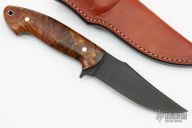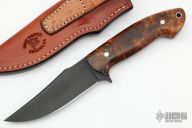This Field and Stream by Master Smith Burt Foster features a black finished blade, .162" blade thickness and 1.255" blade depth, full tang construction. The handle has spalted maple scales with nickel silver pins. Comes with a brown leather sheath and brown leather case. Excellent condition.