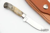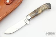 This knife by Bill Kennedy features a satin finished drop point blade with a full tang construction.  .094" Blade Stock.  .668" Blade Depth. The handle features a nickel silver guard, California Buckeye scales and mosaic pins.  Includes a brown Parson’s leather sheath.  Excellent Condition.
