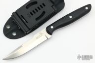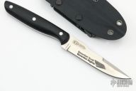 This knife by the Colonial Knife Company features a satin finished with a false top edge, notched thumbrest and a full tang construction.  .191" Blade Stock.  .885" Blade Depth.  The handle features black G10 scales.  Includes a kydex sheath and the original box and papers.  Excellent Condition.