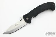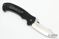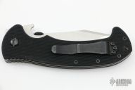 This Tiger by Emerson Knives features a stonewashed blade with thumbdisc and wave feature. The handle has black G-10 scales, titanium liners, black barrel spacers and tip up black stainless steel clip. Has some scuffs and scratches, has been resharpened, otherwise good condition. S/N 0413.  Comes with original box.