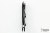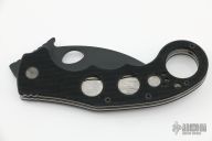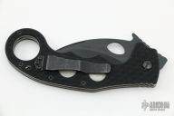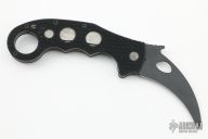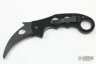 This Emerson Super Karambit has a black chisel ground hawk bill blade with notched thumbrest, thumbhole, flipper and wave feature. Handle is comprised of black G10 scales, titanium liners with and has a lanyard hole at the butt. Also has a black stainless steel clip positioned for right or left handed tip up carry. Nice detent, lockup and blade seating. Serial number 3857. Excellent condition.