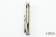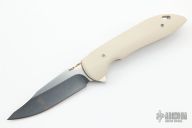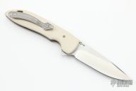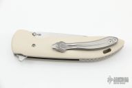 This K2 Linerlock Flipper by Korth Cutlery features a stonewashed blade with notched thumbrest and flipper. The handle has ivory paper micarta scales, orange peel finished titanium liners, backspacer and tip up clip. Includes IKBS (Ikoma-Korth Bearing System) for smooth and fast opening that requires no wrist action. Nice detent, blade seating, and lockup. Knife comes with original Velcro sheath. New condition.