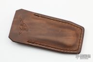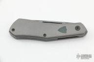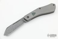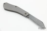 This flipjoint from Jared Oeser features and acid/tumble finish blade with long nail nick. The handle has titanium covers, g10 escutcheon, and liners over layered g10 backspacer. Double detent function. Has nice blade seating, and action. Includes COA, Hank and a leather slip sheath. The knife is in Excellent Condition.