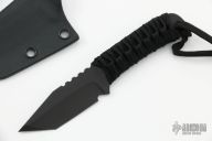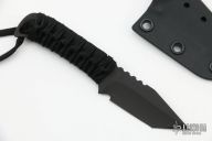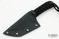 This knife by Mick Strider features a black blade with notched thumbrest, paracord wrap, .080" blade stock and .885" blade depth, full tang construction with cord wrapped handle. Comes with kydex sheath. New condition.