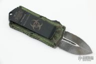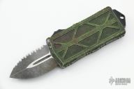 This Microtech Exocet features a stonewash/distressed finish spear point blade with serrations. The handle has aluminum frame and a black clip that doubles as a money clip dated 10/2021 s/n 173. Comes with original box and papers. Excellent Condition.