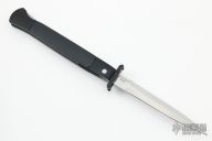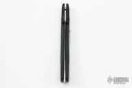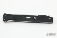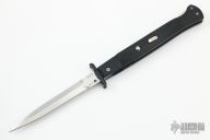 This Phantom Italian swing guard automatic by Dynamic Knife Designs has a satin finish blade and black aluminum handle. Features a ramped side positioned stainless steel safety just below the firing button. False top edge. Button release/single action with closure via the rear positioned lockbar release. Dual leaf and coil spring action providing an extremely fast opening. When closed, the dual guard rests on the frame, encompassing the blade tang. Upon opening, the guard swings into a locked position. Excellent condition.