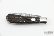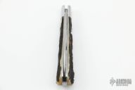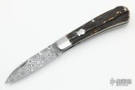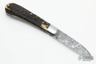This Single Blade Trapper by Tim Robertson features a Damascus blade with nail nick. The handle has stainless steel bolsters and liners, stag covers with stainless steel escutcheon, stainless steel spring. Has half-stop, flush in all positions. Comes with a zippered case. Excellent condition.