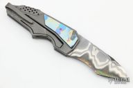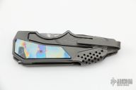 This Commando 3.0 by GTC Knives features a 410/CTS-XHP San Mai blade with notched thumbrest and checkered flipper, blade material was forged by Gus. The handle has an integral bead blasted and carved titanium frame with integral clip, it has 4 alloy black timascus that was also forged by Gus. The handle was made as a flat piece, milled and then folded over as well as the clip. Rides on bearings, nice detent, lockup and blade seating. Comes with nylon zippered case and COA dated 2019. SOLE AUTHORSHIP. Excellent Condition.