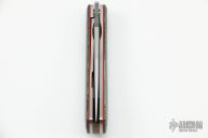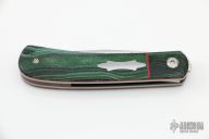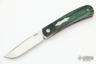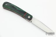 This Front Flipper by Enrique Pena features a hand rub satin finished clip point blade with swedge, notched thumbrest and front flipper. The handle has a green unique canvas micarta bolsters and covers with red G-10 liners, titanium frame, natural canvas micarta backspacer. Includes padded and zippered case. Excellent condition. Brown leather slip sheath.