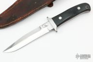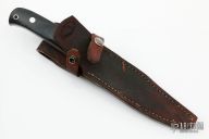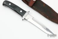 This SR Johnson Style Fighter from Richard A. Rotella features a mirror polished clip point blade with 1" sharpened top edge, .223" blade stock and 1.081" blade depth, full tapered tang construction. The handle is comprised of a stainless steel guard and black canvas micarta scales over orange liners, lanyard tube in pommel. Includes leather sheath with belt loop and COA dated May 21, 2022. Excellent condition.