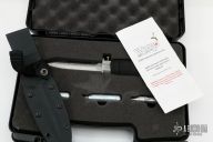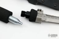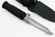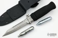 This Wasp scuba knife features a clip point blade with serrated spine, 1/4" blade stock and 1" blade depth, hidden tang construction. The blade has a gas injection system. The handle has a titanium guard with push button for CO2 release, and removable rubber handle where the CO2 cartridge is installed. Comes with original box, and papers. Has some scuffs, otherwise excellent condition.