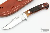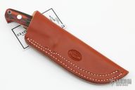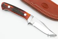 This Texas Hunter by Carl Colson features a mirror polished blade with notched thumbrest, .191" blade stock and 1.047" blade depth, full tapered tang construction. The handle has a 416 stainless steel guard and pins, lanyard hole at the butt, stag scales with red liners. Comes with a Wickett & Craig brown leather sheath made by Carl Colson. Has a scratch on one of the bolsters, otherwise excellent condition. Comes with COA dated 01/22/2020 and #912 on the blade and sheath.