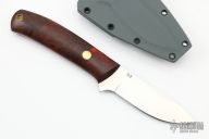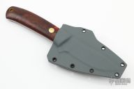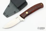 This Frog Bayou Hunter from Dan Crotts features a satin finish drop point blade. .109" blade stock and .9205" blade depth. The handle has cocobolo wood scales, a brass pin and brass lanyard tube over full tang construction. Includes kydex sheath with belt loop set up for horizontal carry. New from maker.