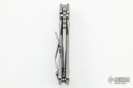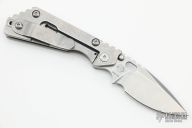 This PT by Mick Strider features a stonewashed blade with notched thumbrest and thumbhole. The handle has a stonewash finished titanium frame with matching tip up clip. New from maker at the 2022 Blade Show.