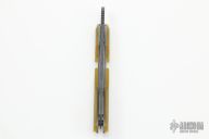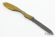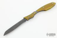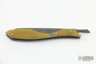 This Model 94 by Nick Swan features a dark stonewashed blade with notched thumbrest, opens like a friction folder and has a double detent system. The handle has amber ultrex scales, tumbled titanium liners. Comes with a COA dated 6/2022. New from maker at the 2022 Blade Show.