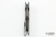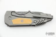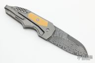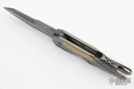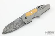 This Integral Reduced Commando by GTC Knives features a Chad Nichols Blackout Damascus blade with notched thumbrest and checkered flipper. The handle has an integral bead blasted and carved titanium frame with integral clip, it has Westinghouse paper micarta inlays with mosaic pins. The handle was made as a flat piece, milled and then folded over as well as the clip, pretty ingenious. Rides on bearings, nice detent, lockup and blade seating. Comes with nylon zippered case and COA dated 2022. New from maker at the 2022 Blade Show.