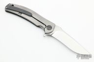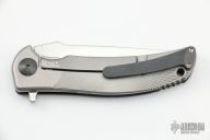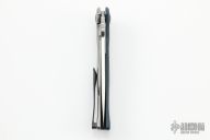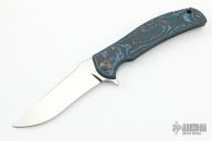 This Q-36 framelock flipper by RJ Martin features a tumble finished Magnacut (RC63) blade with notched thumbrest and a flipper. The handle has a black/blue Fat Carbon and blasted titanium frame and zirconium tip up clip, and a Fat Carbon backspacer. Bearings give the knife a very fast and smooth opening. Nice blade seating, detent and lockup. Comes with a zippered case. New from maker at the 2022 Blade Show.