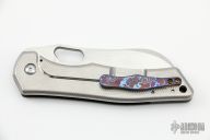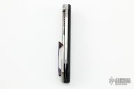 This Custom Catalyst framelock from Gerry McGinnis features a hand rub satin finished blade with thumbhole and notched thumbrest. The handle a carbon fiber front scale with black rag micarta inlay, milled titanium lockside, mokuti tip up clip, carbon fiber backspacer. Blade is centered when closed and locks up with no movement. #011 and dated 5-28-22. New from maker at the 2022 Blade Show.
