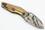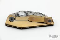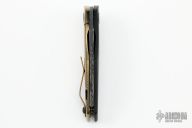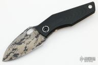 This SJ75 Baby Huey framelock folder by Strider Knives has a digicam blade and a black G10 and flame finished titanium frame with matching tip up titanium clip. File work on blade spine and inner edges of frame along the spine. Blade is centered when closed and locks up with no play. Has some light scuffs, otherwise excellent condition.
