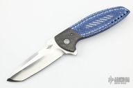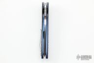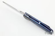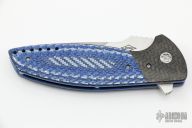 This Cayman XL by Peter Carey features a satin finished blade with notched thumbrest and flipper. The handle has carbon fiber bolsters, blue twill scales, anodized and textured titanium liners, orange peel finished titanium tip up clip. Nice detent, lockup and blade seating. Excellent condition.