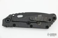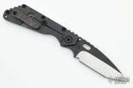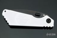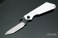 This SMF by Mick Strider features a hand ground tanto blade with thumbhole and notched thumbrest. The handle features white coated milled aluminum and a flamed titanium frame with a matching tip up pocket clip.   Notches on thumbrest, rear of handle.  Includes lockbar stabilizer. Nice detent, blade seating and lockup. New from the 2022 CCKS. This was the show special.