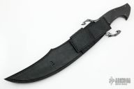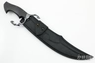 This knife by The Sobral Brothers is incredible, it features a Damascus clip point recurve blade with a nearly sharpened top edge, .258" blade stock and 2.54" blade depth, hidden/frame tang, with tapered construction. The handle has a lavish blued steel guard with gold inlays, carbon fiber grip and stainless pins. Fits amazing in the hand. Comes with a skillfully hand-tooled leather sheath, and a very classy leather zippered case. New from maker. They just keep getting better and better don't they!