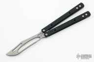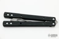 This Trainer balisong by JK Design features a milled, Zirblast finish, upswept recurve clip point bade. The handles are comprised of g10 with milled full channel, bronze phosphorus washers and steel bushings. Comes with Zipper case, and makers card. New from Maker.