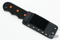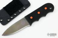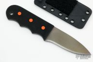 This Knife by John Gray features an anodized titanium blade with .055" blade stock and 1.275" blade depth, full tang construction. The handle has black G-10 scales with orange G-10 pins and a lanyard hole. Comes with a kydex sheath. New from maker at the 2022 Blade Show.