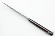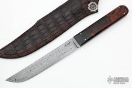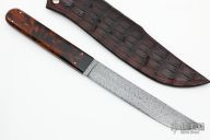 This Tanto by Erik McCright features a Multi-Bar Turkish Twist Damascus blade (1080 and 15N20), .208" blade stock and 1.032" blade depth, full tang construction. The handle has stabilized desert ironwood burl scales with domed pins. Comes with a hand tooled brown leather sheath and a zippered case. New from maker at the 2022 Blade Show. Comes with a COA dated 5/3/22.