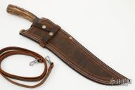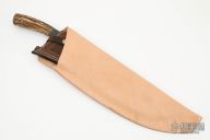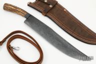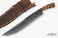 This Camp Knife by Erik McCright features a hand forged W1 blade with forge finished flats and integral bolsters/guard, .300" blade stock and 2.484" blade stock, hidden tang construction. The handle has a stag grip with textured copper spacer, steel butt plate with copper pin. Comes with a brown leather sheath with shoulder rig. New from maker at the 2022 Blade Show. Comes with COA dated 5-17-22.