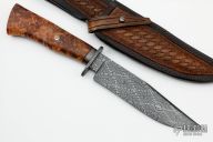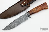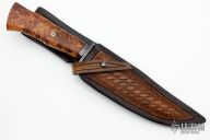 This Hunter by Journeyman Smith Kelly Vermeer Vella features a Mosaic Damascus blade with .174" blade stock and 1.306" blade depth, hidden tang construction. The handle has a Mosaic Damascus guard with matching pattern as the blade, Cu-Mai Damascus spacer, burl wood grip with custom mosaic pin. Comes with a hand tooled brown/black leather sheath. Comes with zippered case. New from maker at the 2022 Blade Show.