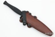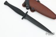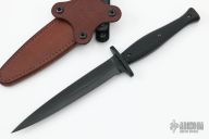 This Custom Dagger by Les George features a black double edged blade with .192" blade stock and 1.009" blade depth, full tang construction. The handle has checkered black G-10 scales. Comes with a brown leather sheath by Chattanooga Leatherworks. New from maker at the 2022 Blade Show. Comes with a zippered case.