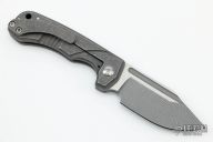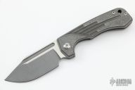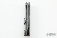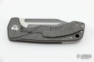 This Oblivion folder from Jason Stout features a tumble finished milled blade with fullers. The handle has a tumbled titanium frame, has a tip up titanium clip, and art deco pattern on scales. Blade is centered when closed and locks up with no play. Rides on bearings. Comes with COA and zipper case. New from the 2022 Blade show.