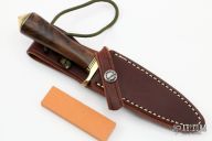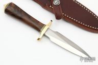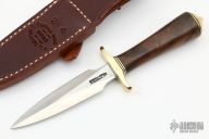 This Model 2-4 by Randall Made Knives features a satin finished double edged blade, .167" blade stock and .908" blade depth, hidden tang construction. The handle has brass guard and butt, walnut grip with black/brass spacers. Comes with brown leather sheath and original papers and stone. New from maker.