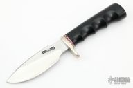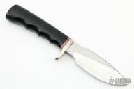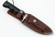 The Model 11 is the original drop-point blade. Designed by Tommy Thompson, noted Alaskan guide, in 1952 for big-game skinning, with point dropped below top of blade to prevent cutting too deeply through skins when used point first. This knife has a carbon steel blade with notched thumbrest, .183" blade stock and 1.329" blade depth, hidden tang construction. The handle has a nickel silver guard, black linen micarta finger grip, and red/white/blue spacers. Comes with a brown leather sheath and original papers. New from maker.