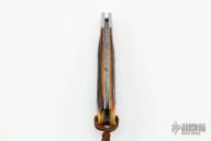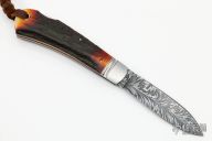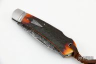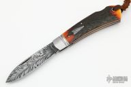 This Lockback from Tobin Hill features a Feather Damascus blade with nail nick. The handle has threaded and fluted stainless steel bolsters, stag covers with a Damascus escutcheon, fileworked stainless steel liners, stainless steel backspacer/lockbar. Includes padded and zippered case. Brand new from maker at the 2022 Blade Show.