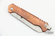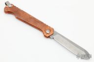 This Cracker Slipjoint by Jon Graham features a tumble finished blade with notched thumbrest. The handle has an integral copper frame with internal stainless steel spring and titanium lanyard bail. Comes with a deagon cut slip sheath. Excellent condition.