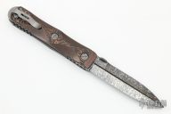 This EK Folder by Allen Elishewitz features a Black Snow finished blade with fullers, false top edge and a thumbdisc. The handle has black/copper fat carbon scales patterned after an EK Knives dagger, bead blasted titanium liners, tip up stainless steel clip, black G-10 backspacer. Rides on bearings, nice detent, lockup and blade seating. Comes with velcro case. New from maker at the 2022 Blade Show.