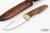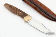 This SS Hunter by Anders Hogstrom features a clip point hand rub satin finished stainless steel blade with .180" blade stock and 1.037" blade depth, hidden tang construction. The handle has textured bronze guard with a stabilized Masur Birch Burl grip with heirloom fit. Comes with a beautifully done Nordic style leather sheath and velcro case. New from maker at the 2022 Blade Show.