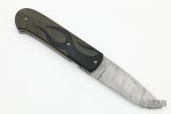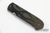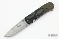 This EDC folder has a Damasteel blade with single thumbstd. The handle has black G-10 and green canvas micarta scales, titanium liners and a stainless steel clip that retracts into the spine. Smooth action. Nice blade seating, detent, and lockup. Excellent work. Excellent condition. Comes with a zippered case and another set of black G-10 scales.