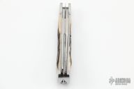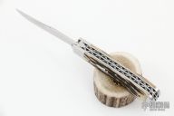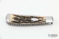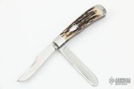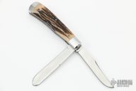 This Trapper by Tobin Hill features hand rub satin finished blades with a single nail nicks. The handle has stainless steel bolsters and stag covers with a stainless steel arrow head escutcheon, stainless steel liners and fileworked springs. Includes a padded zippered case. New from maker at the 2022 Blade Show.