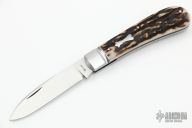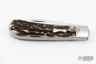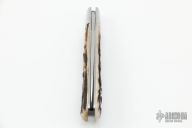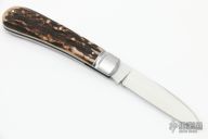 This Slipjoint by Jim Dunlap features a hand rub satin finished blade with nail nick. The handle has fluted stainless steel bolsters, stag covers with stainless steel escutcheon, stainless steel liners and spring. Has half-stop, flush in all positions. Comes with a zippered case and COA. New from maker at the 2022 Blade Show.