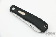 This Slipjoint by Jim Dunlap features a hand rub satin finished blade with nail nick. The handle has black linen micarta covers with ivory paper micarta escutcheon, stainless steel liners and spring. Has half-stop, flush in all positions. Comes with a zippered case and COA. New from maker at the 2022 Blade Show.