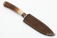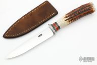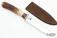 This Hunter by Jim Behring features a satin finished convex ground blade with .109" blade thickness and .894" blade depth, hidden tang construction. The handle has a nickel silver guard and cap, stag grip, with red/aluminum/yellow/black/blue spacer pattern. Great look and feel. Comes with a brown leather sheath. New from Maker at the 2022 Blade Show.