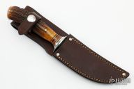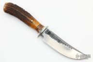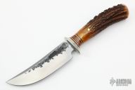 This Hunter by Jim Behring features a satin finished and hammer marked hollow ground blade with a false top edge, .244" blade thickness and 1.24" blade depth, hidden tang construction. The handle has a nickel silver guard, vintage sambar stag grip, black/red/yellow spacer pattern, and domed musk ox butt. Great look and feel. Comes with brown leather sheath.New from maker at the 2022 Blade Show.